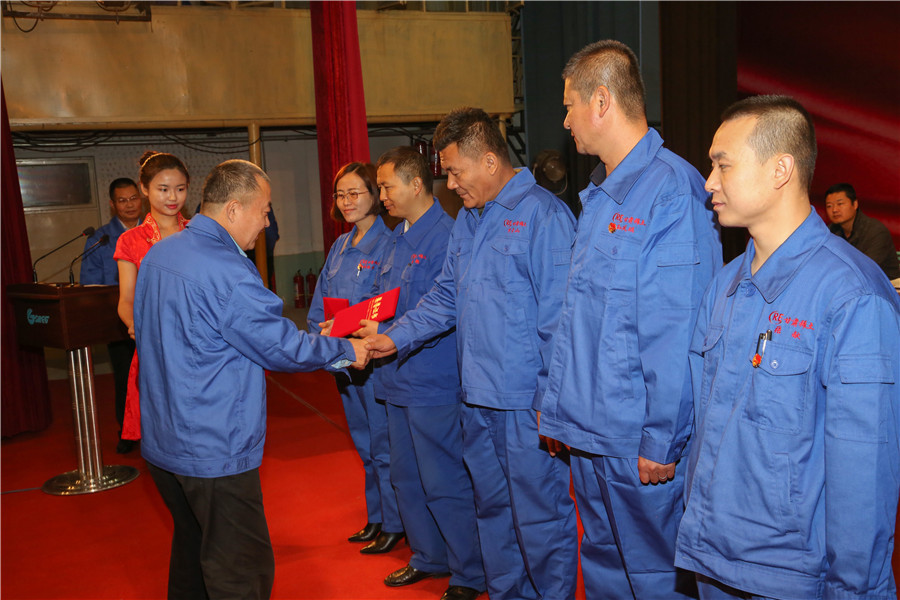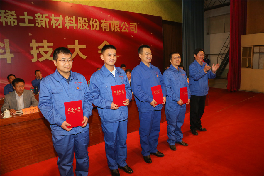 公司副总经理韩满璇宣读了《关于表彰奖励2017-2018年科技进步奖项目的决定》。201车间、204车间、试剂车间共同完成的公司水处理升级改造项目等4个项目被评为科技进步一等奖;204车间完成的不同矿相的稀土精矿在三代酸法分解工艺中的高效运用项目等10个项目被评为科技创新二等奖;218车间完成的稀土氧化物节能焙烧项目等7个项目被评为科技创新三等奖;检测中心完成的离子色谱仪分析方法的开发应用等4个项目被评为科技创新标准奖。与会相关领导为获奖项目代表颁发了获奖证书。