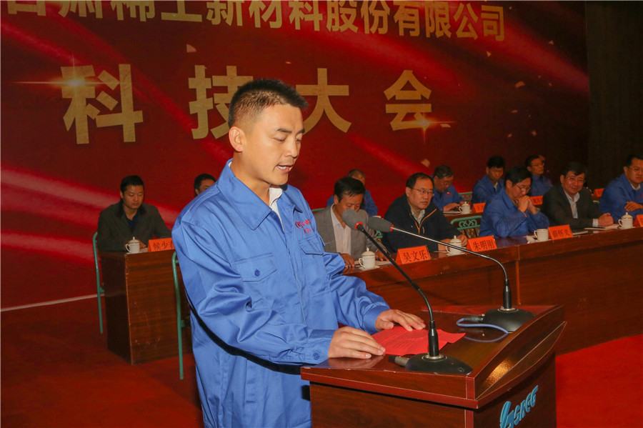 201车间工程技术人员胡志龙代表受到表彰的项目单位作表态发言,向公司广大科技人员发出倡议,决心以此次表彰为契机,化表彰为动力,继续以锲而不舍、持之以恒的坚韧毅力,锐意进取、自强不息,发挥崇尚科技、追求卓越的示范表率作用,积极主动学习,钻研技术,增强创新本领,在今后的工作中拿出标志性的、引领性的科技成果。