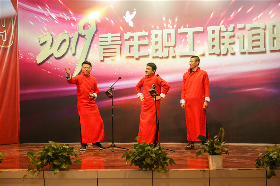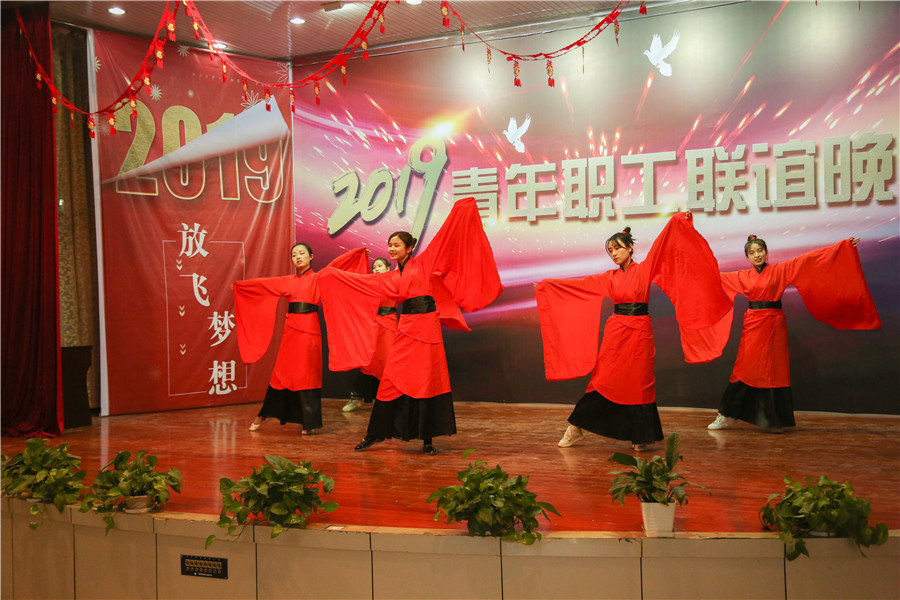 晚会在热情四射的舞蹈串烧《时代在召唤》中拉开帷幕。本场晚会节目内容丰富多样、精彩纷呈,各单位、部门的青年员工自编自排自演的相声、舞蹈串烧、小品、古典舞、男声独唱、诗朗诵等十二个节目,让到场嘉宾尽享视听盛宴,整场晚会还穿插了紧张刺激的顶气球、抢水杯、摇摆乒乓球等互动游戏,台上台下欢声笑语、气氛热烈,精彩的表演赢得了观众阵阵掌声,晚会在一曲温馨的“相亲相爱一家人”合唱中精彩落幕。