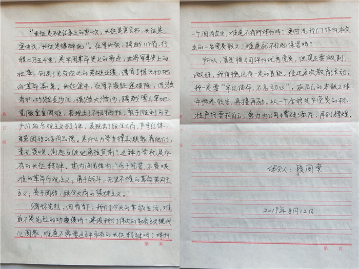 作为车间一名技术人,在公司科技创新的路上更应该不忘初心,用心创新,用新正心,更好的传承和发扬长征精神。一是要将理想信念作为精神支柱。理想信念是长征之魂,是胜利之源。对于我们每一名党员而言,正确地理想信念同样至关重要。我们每个人的职场生涯就是一段属于我们的长征路,组织交给我们的每一项任务就是我们所面对的长征路上的关口和战役。我们要坚定理想信念,担当责任,迎难而上,驱动自身不断前进。二是要将积极乐观作为力量之源。长征之所以能够让人们铭记,不仅仅是因为其规模声势的浩大,更是因为在长征途中红军将士克服了一道道看似不可能克服的艰难险阻。在工作生活中,我们难免会碰到各种困难和挑战,往往在这个时刻我们就需要像红军战士们一样,逼自己一下,推自己一把,就会离成功更进了一步。在无数个枯燥乏味的技术试验论证过程中,必须要拿出义无反顾,勇往直前的“冲劲”,埋头苦干、心无旁骛的做好每一个琐粹的工作,对每一个技术改造项目严谨认真,专心科研,努力做好每个细节;对每一次实验结论反复验证、反复推敲,与生产实际高度吻合,才能真正解决车间和公司技术方面的实际问题。