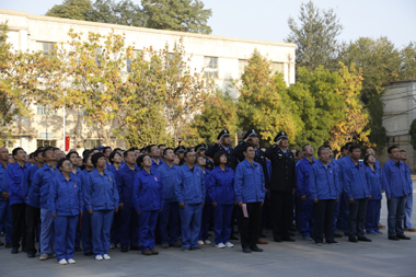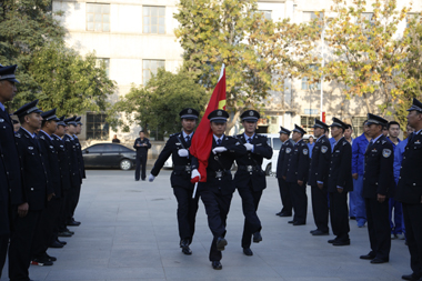 由武装保卫职工组成的3名护旗手迈着铿锵有力的步伐护送国旗进场,国歌声奏,升旗手振臂将国旗展开,五星红旗顺着朝阳的方向徐徐升起,在场全体同志肃穆而立致以崇敬的注目礼,送上了对祖国最美好的祝福。