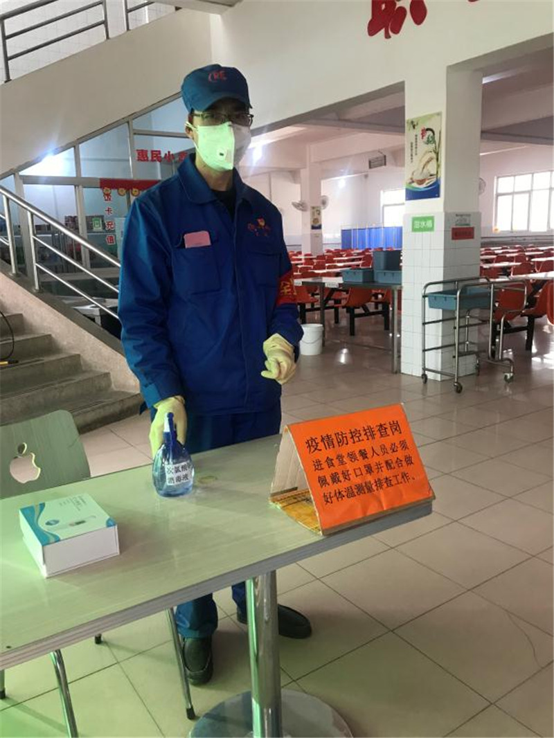 (食堂门口设有“测温台”,安排专人使用红外线测温仪对进入食堂的人员进行体温检测)