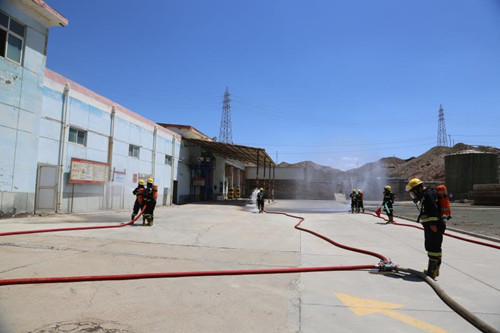 本次演练现场模拟液氯3#储槽液面管破裂、穿孔,导致大量液氯泄漏。事故发生后,烧碱厂立即启动车间《氯气泄漏事故应急预案》,开展自救和人员疏散,由于险情升级,随后启动公司《液氯泄漏应急预案》,公司武装保卫部快速响应,现场救援由救援编队及消防移动水炮对现场泄漏的氯气进行稀释,及时有效地化解了险情,白银第一人民医院稀土分院对事故中的中毒人员进行了及时转移和救治。