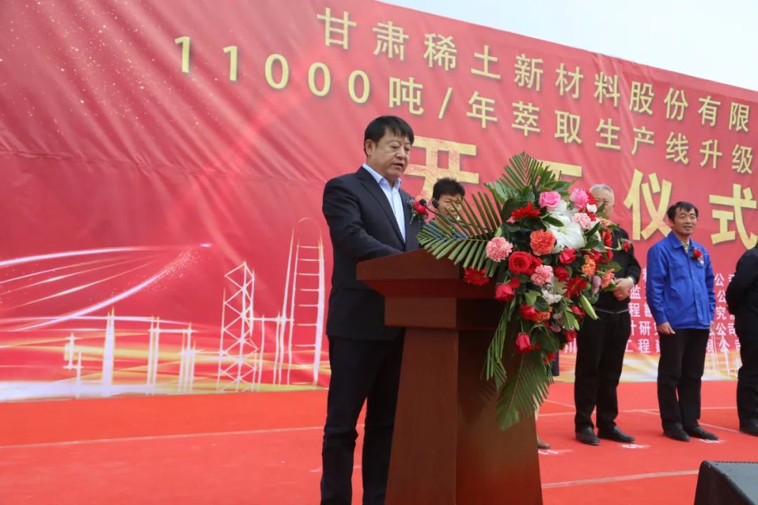 开工仪式上,刘培勋致辞并介绍项目情况。甘肃稀土11000吨萃取生产线升级改造项目,是公司全面贯彻习近平总书记视察甘肃重要讲话精神和对稀土产业发展重要指示批示的具体实践,也是有效落实甘肃省打好产业基础高级化产业链现代化攻坚战专项行动的责任担当,更是深入推进产业提档升级开创企业高质量发展的重要举措。项目总投资1.55亿元,总占地面积13044m²,主厂房建筑面积8580m²,项目集成北京大学、兰州大学、五矿稀土研究院、有研集团等国际国内顶尖技术团队成果,采用先进联动萃取全分离新工艺,实现全自动集中控制,酸碱及能源单耗大幅降低,产品品质及工艺灵活性大幅提升,一条生产线上可同时生产镧、铈、镨、钕、钐铕钆富集物等五种产品。项目建成后,将成为我国稀土行业单体产能最大的萃取生产线,工艺装备、技术指标、资源利用、节能环保、自动化程度等都将达到行业领先水平,实现真正意义的“绿色化、数字化、智能化”转型升级。