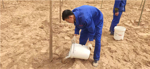 植树活动现场,公司党委副书记、纪委书记、工会主席邓家恂与劳模、优秀党员、先进生产者们一起按照划分的区域,全力以赴投入到植树活动中。大家两人一组分工协作,挖坑、运苗、扶苗、填土、踩实,大家不怕脏、不怕累,干劲十足,认认真真的将一棵棵树苗栽好。活动中劳模先进们奋勇当先、埋头苦干的实干精神,充分体现了新时代广大劳动者的精神面貌。一上午热火朝天的劳动后,共种植河北杨201棵,国槐600棵,新增添绿化面积3000平方米。