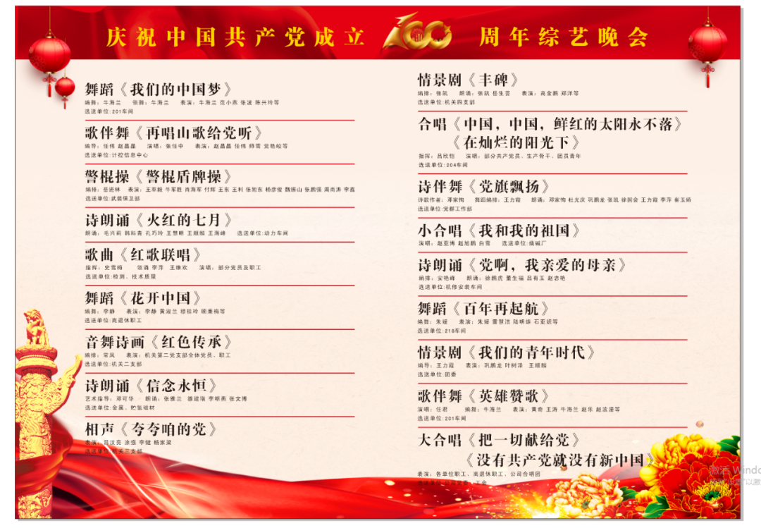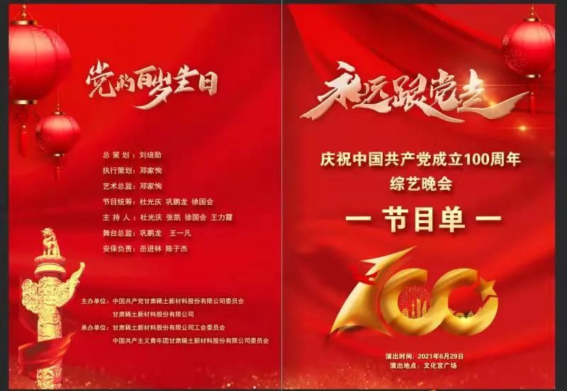为庆祝中国共产党成立100周年,深入开展党史学习教育暨保持艰苦奋斗弘扬企业精神,甘肃稀土“永远跟党走”庆祝中国共产党成立100周年大型综艺晚会将于6月29日(星期二)晚8:00在文化宫广场倾情上演。