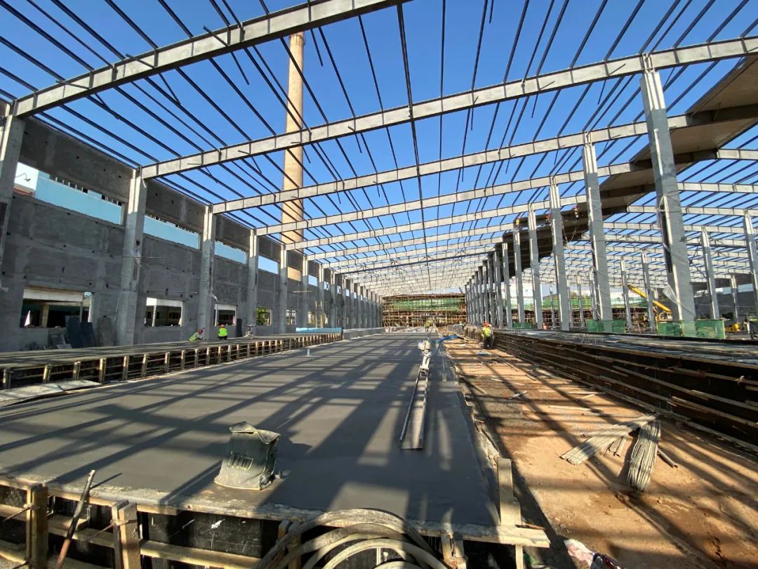 ☞ 已完成1-3、A-R轴线配电间基础、框架一层混凝土浇筑,正在进行二层钢筋模板安装。