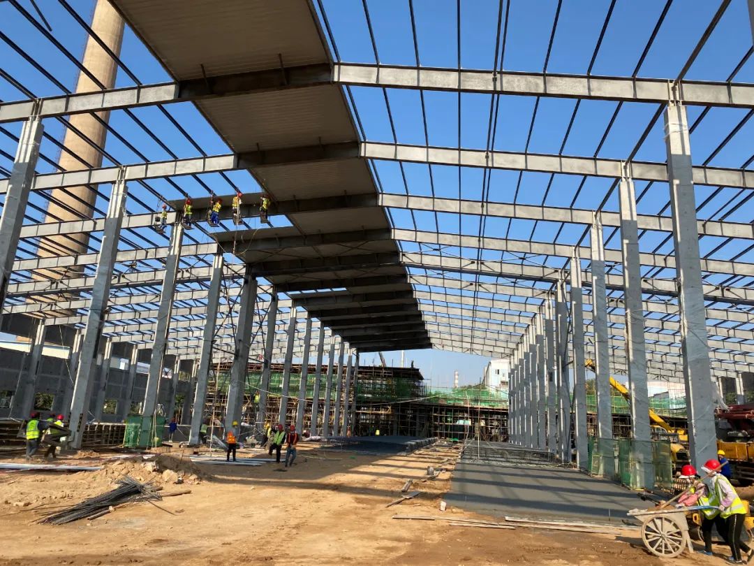 ☞ 已完成4-21、A-R轴线萃取厂房基础,混凝土框架柱,钢梁、檩条安装,正在进行屋面内瓦安装和室内设备基础浇筑。