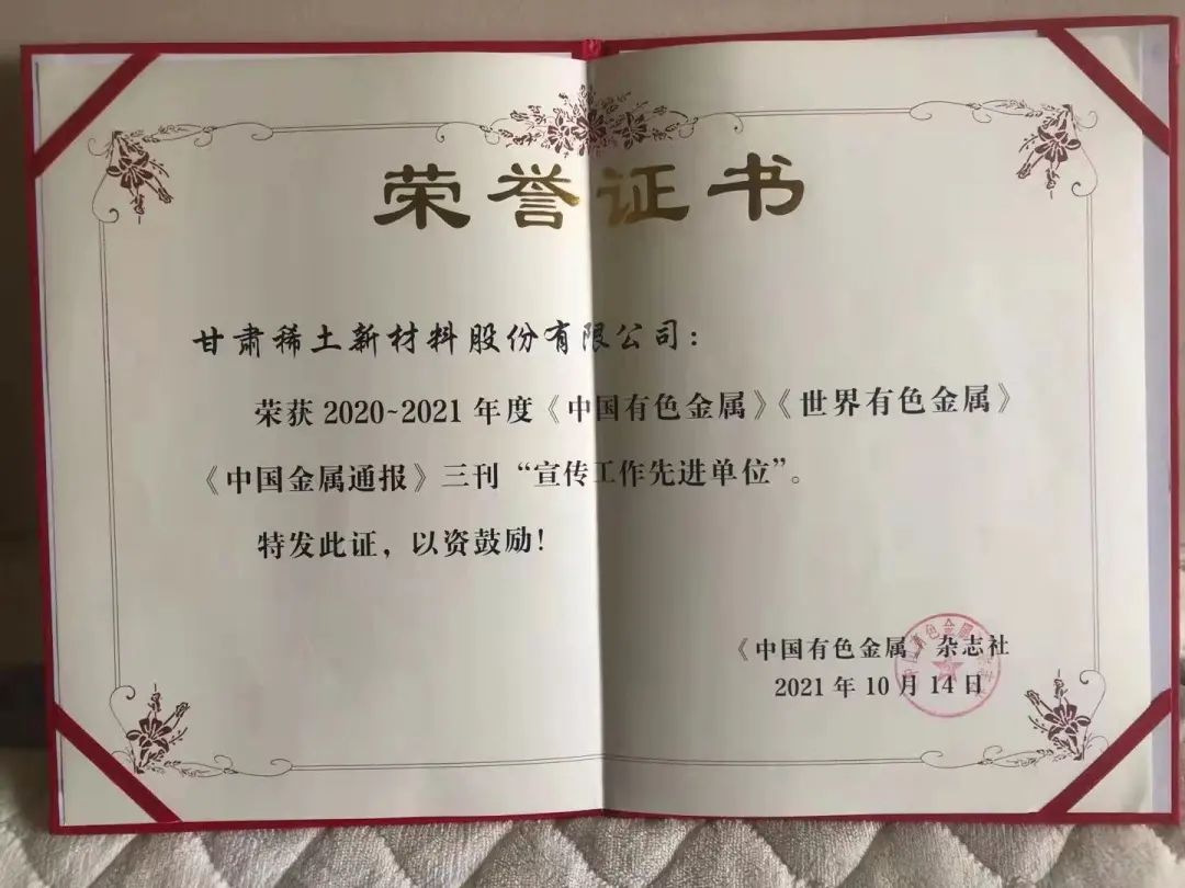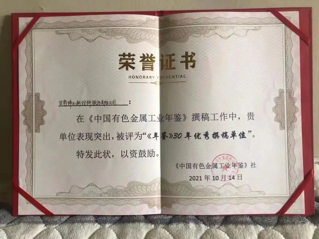 会议还表彰了年鉴30年优秀撰稿人、优秀撰稿单位,2020-2021年度优秀特约通讯员、宣传工作先进单位、杂志好文章。公司喜获《中国有色金属工业年鉴》30年优秀撰稿单位、2020-2021年度《中国有色金属》《世界有色金属》《中国金属通报》三刊“宣传工作先进单位”。