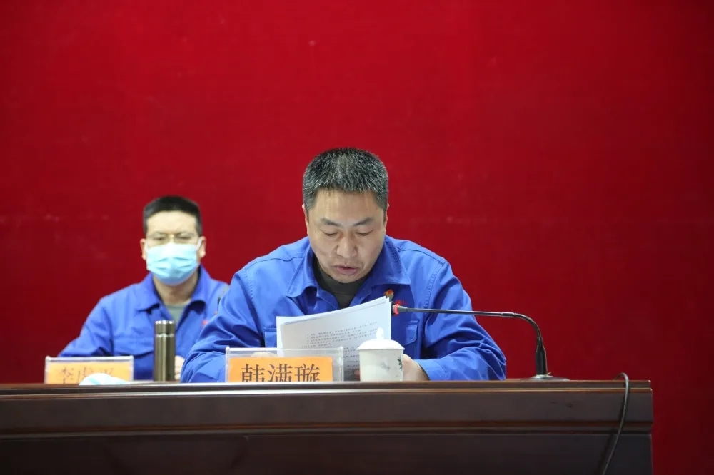公司党委委员、副总经理韩满璇宣读《关于表彰奖励 2021年度宣传工作先进单位及优秀通讯员的决定》及《关于表彰奖励公司党委党史学习教育暨保持艰苦奋斗弘扬企业精神主题实践“党在我心中,颂歌献给党”主题征文活动先进单位、优秀征文的决定》。