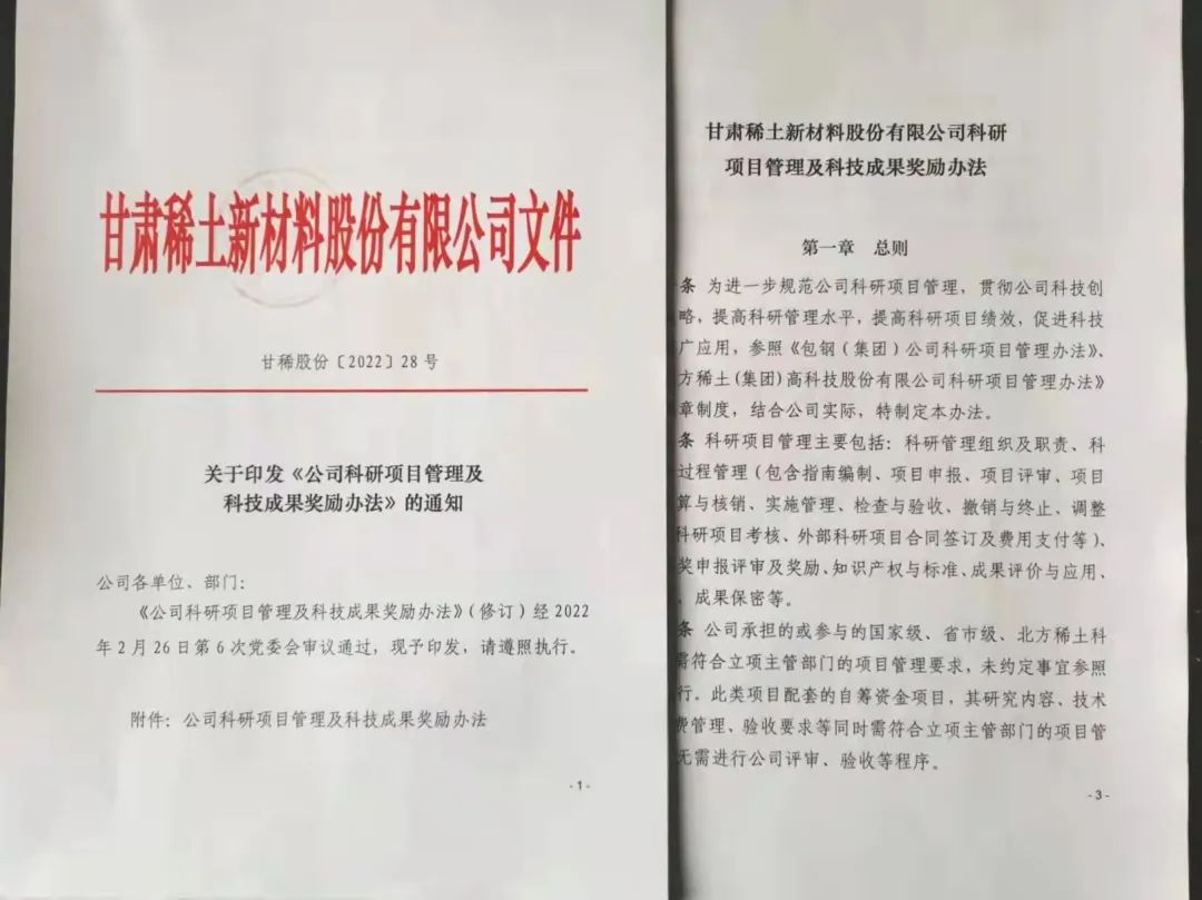 根据公司《科研项目管理及科技成果奖励办法》、《科研项目“揭榜挂帅”管理办法》规定,2022年3月10日公司第8次党委会议审议通过了2022年“揭榜挂帅”科研项目榜单,首批项目来自公司稀土加工分离及其功能材料方面,包括公司水资源循环利用研究、稀土精矿高温硫酸强化焙烧工艺中提高铁元素利用率的工艺开发、无钴含钇型贮氢粉的开发与研究、 TFT用稀土抛光粉制备与研究等4项,主要涵盖工艺研究、装备改造和技术进步领域,项目已于3月上旬面向公司发布。