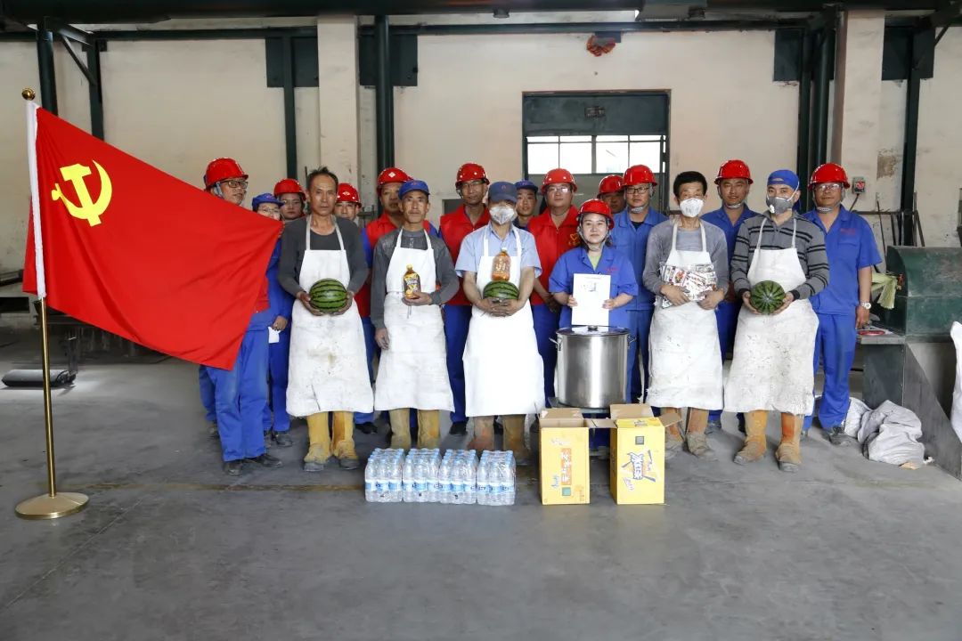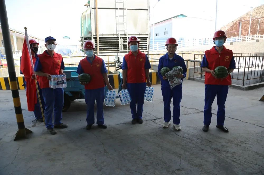 艳阳似火,酷热难当,为确保金属车间电解岗位员工在高温酷暑季节的身体健康和工作安全,营造良好的工作氛围,有效改善职工夏季生产生活条件,6月7日上午,金属车间党支部联合后勤保障中心党支部开展“夏送清凉”主题党日活动,为金属车间奋战在一线的岗位职工送去了西瓜、冷饮、浆水、咸菜等防暑降温物品,献上了一份诚挚的关怀。