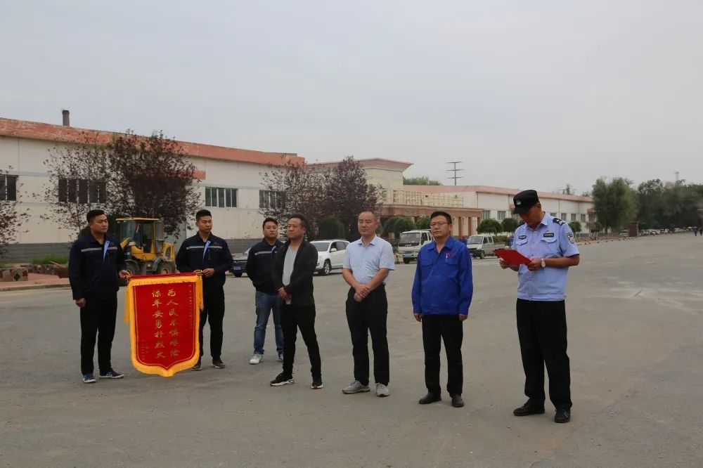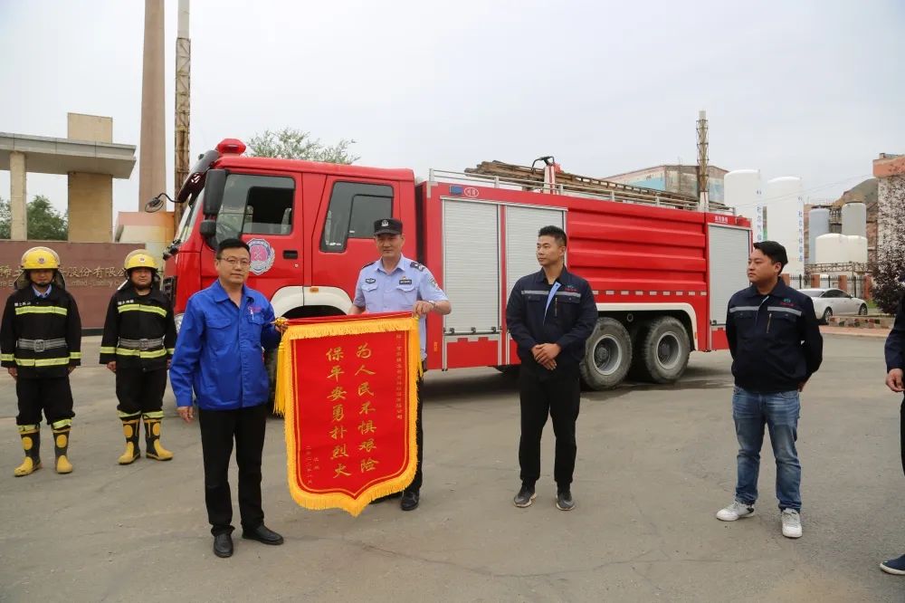 8月31日上午,刘川工业集中区亿盛环保科技有限公司负责人在园区管委会领导的陪同下,专程来到公司,紧紧握住公司党委委员、工会主席韩俊国的手连声道谢,并赠送写有“为人民不惧艰险、保平安勇扑烈火”内容的锦旗,对公司武装保卫消防队员在紧急关头、出警迅速、英勇战斗表示衷心的感谢。