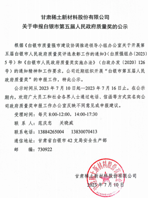 尊龙手机版官网股份有限公司关于申报白银市第五届人民政府质量奖的公示